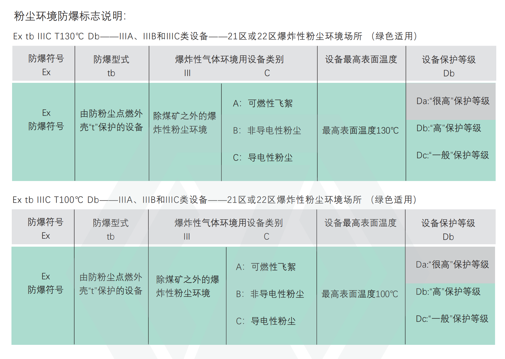 IIIC T130°C Db,Ex db IIB T5 Gb / Ex tb IIIC T100°C Db。