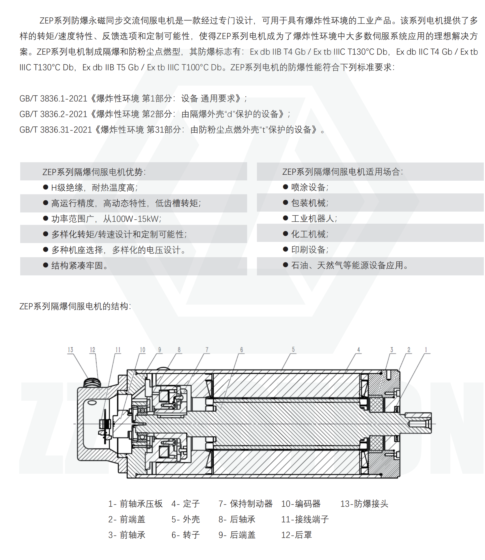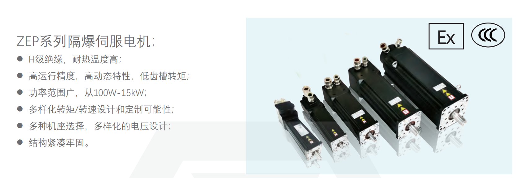 气体/粉尘隔爆类伺服电机 适用于一区、二区、二十一区、二十二区,70~300mm法兰尺寸,0.1~15KW功率范围可选。其防爆标志有:Ex db IIB T4 Gb / Ex tb IIIC T130°C Db,Ex db IIC T4 Gb / Ex tb