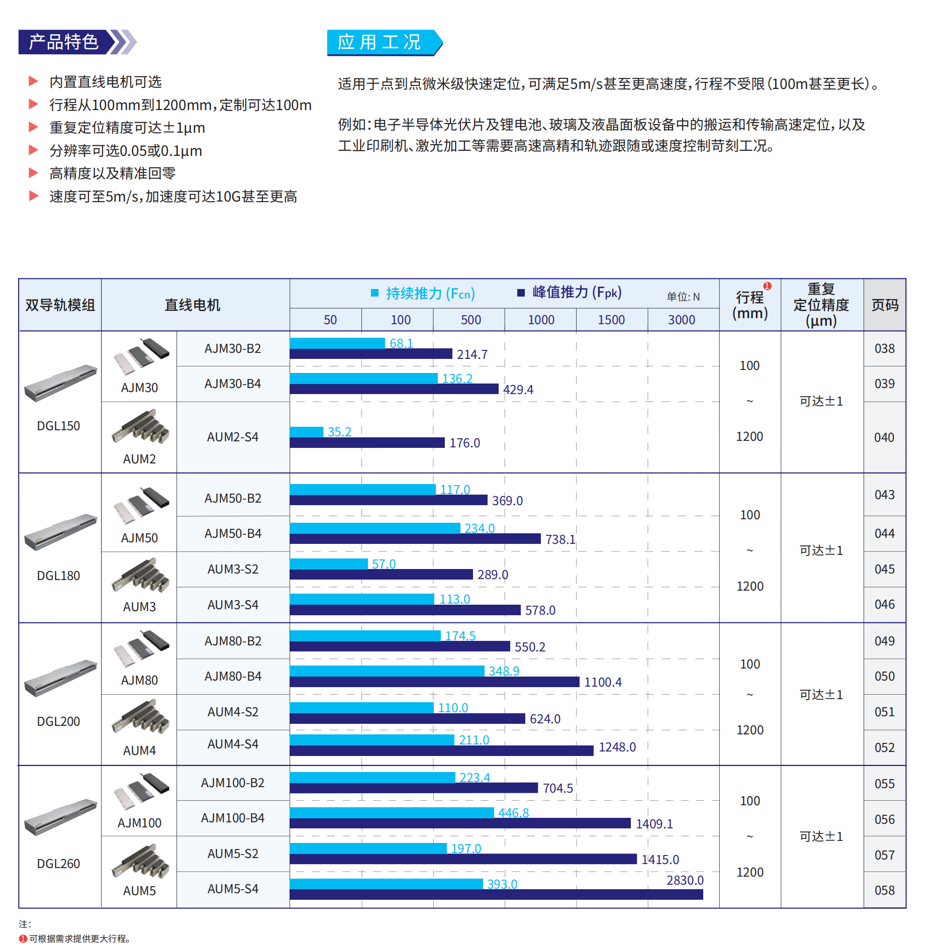 双导轨直线电机平台 ,由双导轨、直线电机、编码器反馈和铝制外壳组成紧凑、高性能模组。行程100~12000mm,重复定位精度±1um,速度可到5m/s,加速度可达5G。